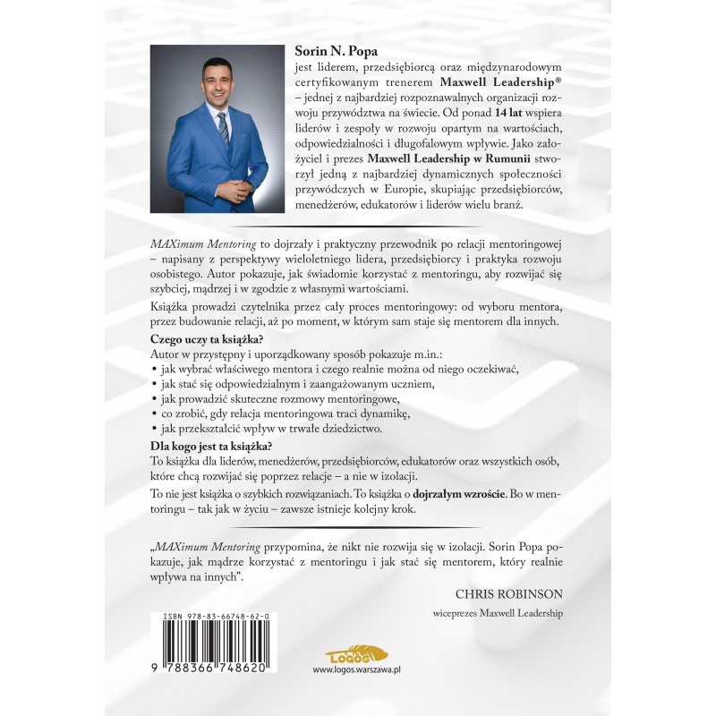 To książka dla liderów, menedżerów, przedsiębiorców, edukatorów oraz wszystkich osób, które chcą rozwijać się poprzez relacje – a nie w izolacji. To nie jest książka o szybkich rozwiązaniach. To książka o dojrzałym wzroście. Bo w mentoringu – tak jak w życiu – zawsze istnieje kolejny krok. „MAXimum Mentoring przypomina, że nikt nie rozwija się w izolacji. Sorin Popa pokazuje, jak mądrze korzystać z mentoringu i jak stać się mentorem, który realnie wpływa na innych”. Chris Robinson wiceprezes Maxwell Leadership